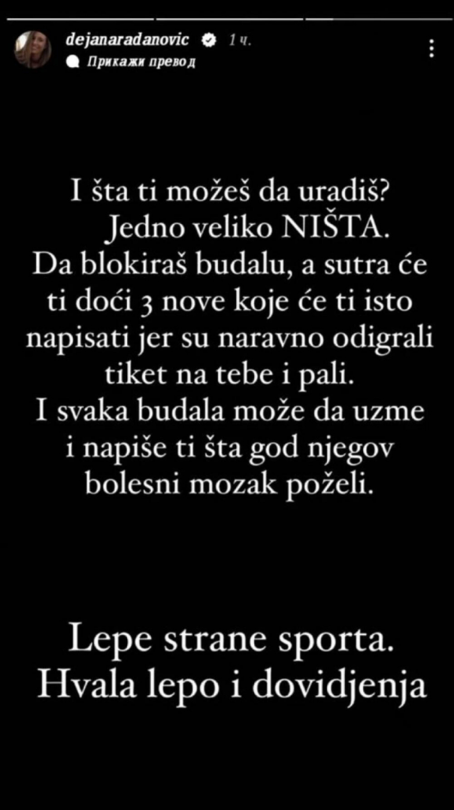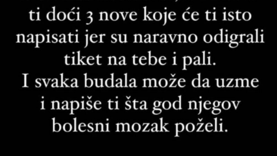 - I šta ti možeš da uradiš? Jedno veliko ništa. Da blokiraš budalu, a sutra će ti doći tri nove koje će ti isto napisati, jer su naravno odigrali tiket na tebe i pali - napisala je Dejana Radanović na instastoriju i dodala: