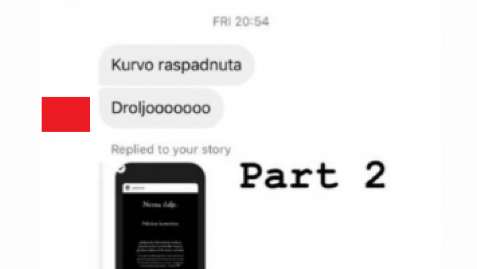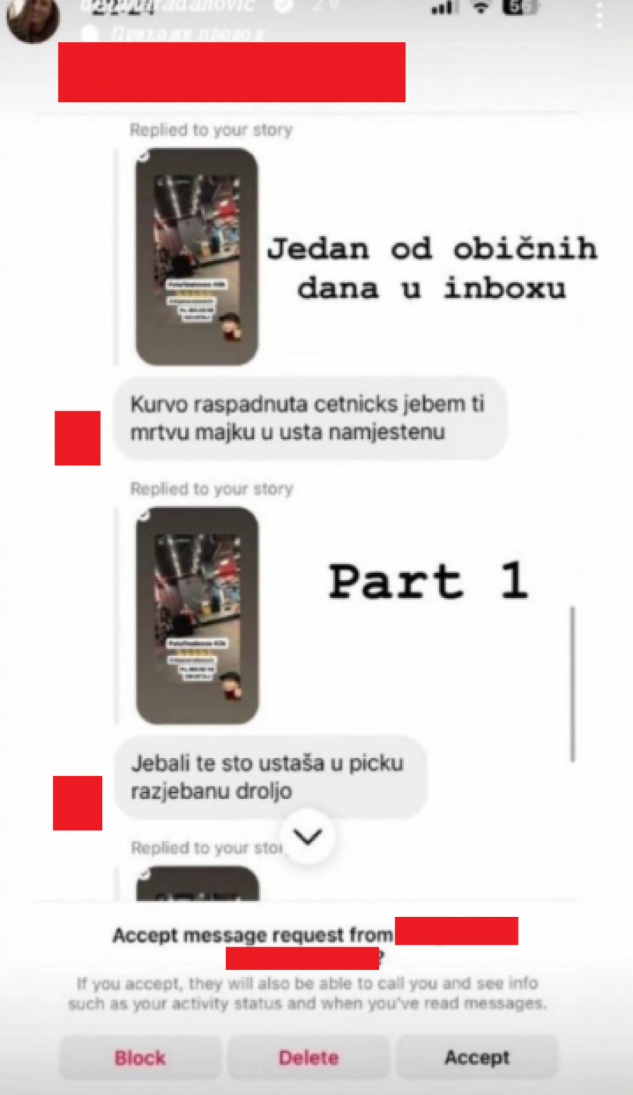 - Jedan od običnih dana u inboksu - napisala je Dejana postavljajući printskrinove sramnih poruka, u kojima je nazivaju "ku**om raspadnutom četničkom“, psuju joj „mrtvu majku nameštenu“ - napisala je Dejana i nastavila: