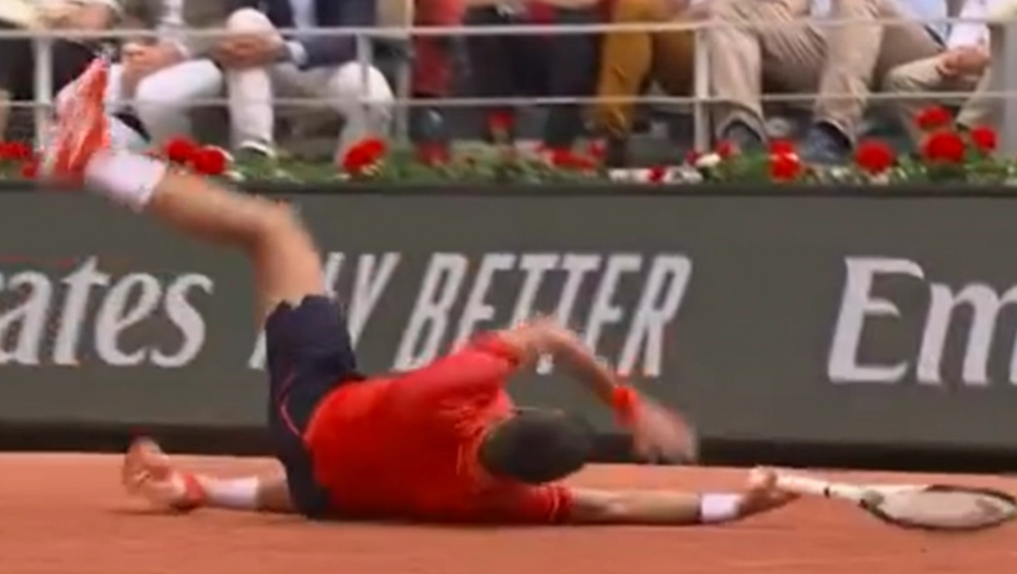 Nole je pokušao da stigne lopticu, a onda je pao. Srećom na vreme je uspeo da ispusti reket i nije došlo do povrede.