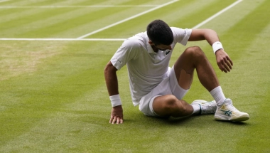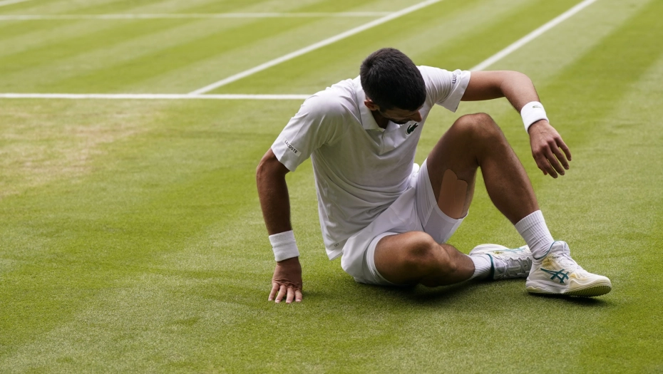Pri rezultatu 4:3 za Novaka, bilo je 40:15 na servis Alkaraza. Novak je u trku pokušao da vrati jednu loptu Španca, ali je pao na travu, jer mu je zapela leva noga, pa su se svi navijači Srbina na trenutak uplašili.