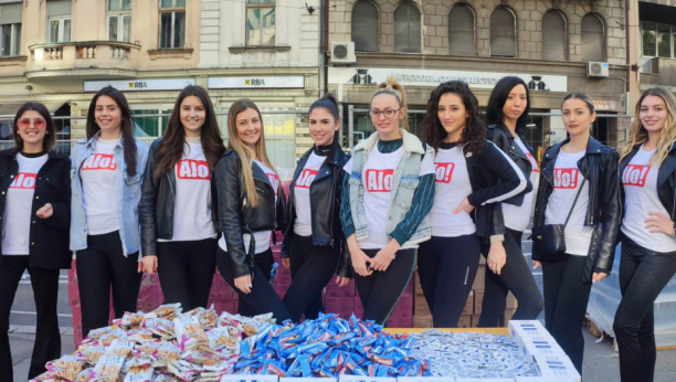 Promoterke Alo! odmah iza ciljne kapije, kod Palate Albanija, u dobrom raspoloženju razvrstavaju slani i slatki okrep za sve učesnike ovog velikog događaja.