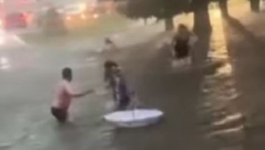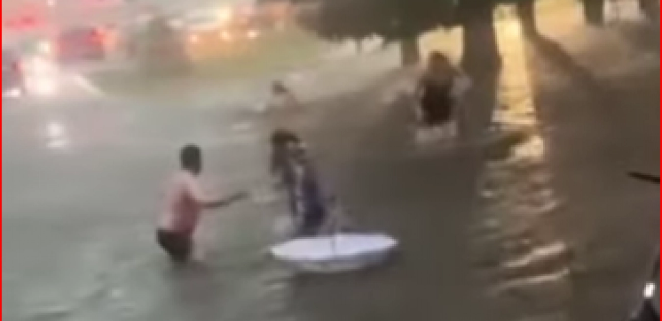 Pljusak je potopio nekoliko ulica, a na jednom snimku se vide ljudi koji se bore da dođu na suvo kada je udario grom.