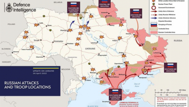 Najnovija mapa situacije u Ukrajini, koju britansko Ministarstvo odbrane objavljuje svaki dan otkako je počeo sukob s Ukrajinom, pokazuje velike promene. Naime, oblasti oko Kijeva označene su kao oslobođene.