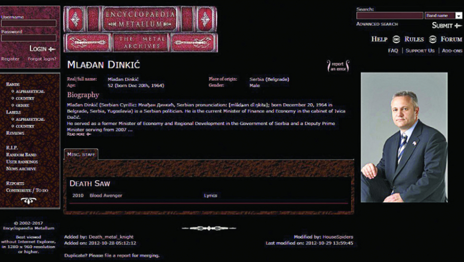 Verovali ili ne, bivši ministar Mlađan Dinkić ima stranicu na najvećoj metal enciklopediji na svetu “Encyclopaedia Metallum”. Doduše, na ovom sajtu možete se više informisata o njegovoj bivšoj političkoj karijeri, nego o muzičkoj.