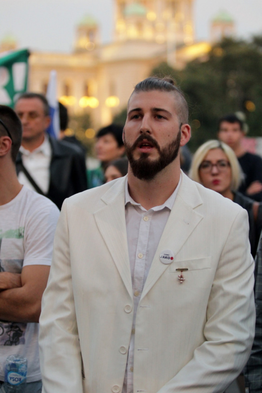 Pažnju građana na protestu posebno je skrenuo Ljubiša Preletačević Beli, lider pokreta "Sarmu probo nisi" iz Mladenovca, koji se ispred gradske skupštine rado pozdravljao i slikao sa svima koji su to želeli.