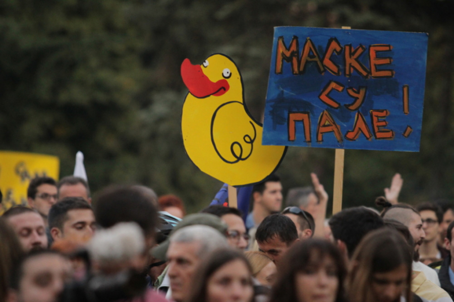 Pod sloganom "Nema straha, nema predaje", više hiljada učesnika šestog po redu protesta, nosili su transparente na kojima je pisalo: "Nikad više robom", "Ne damo", "Pada Mali, pašće i veliki", "Maske su pale", "Fantomke vam lepo stoje", "Zbog slobode, ne damo", kao i žutu patku koja je postala simbol protesta.
