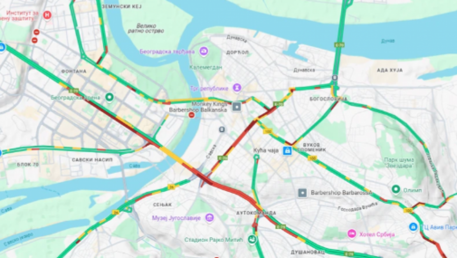 Kako se na mapama može videti, gužva i je u centru grada, tačnije u Takovskoj ulici, pa sve duž Kneza Miloša, kao i u Dečanskoj, na Zelenom vencu, Terazijskom tunelu, Cetinjskoj, Bulevaru despota Stefana i Beogradskoj ulici.