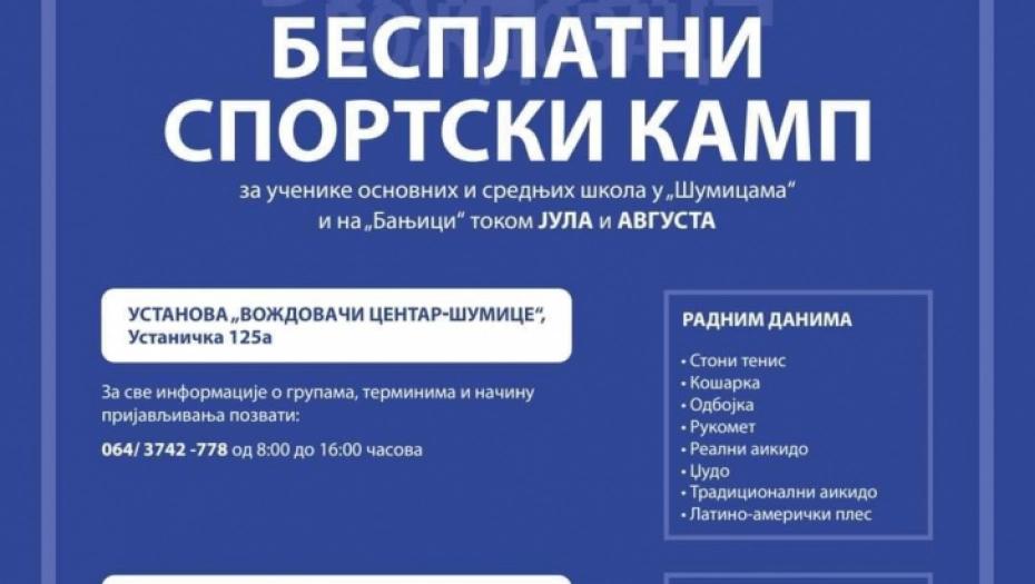 U toku letnjeg raspusta, za učenike osnovnih i srednjih škola, biće organizovani besplatni sportski kampovi košarke, fudbala, rukometa, odbojke, stonog tenisa, aikida, rvanja, džuda i latino-američkog plesa.
