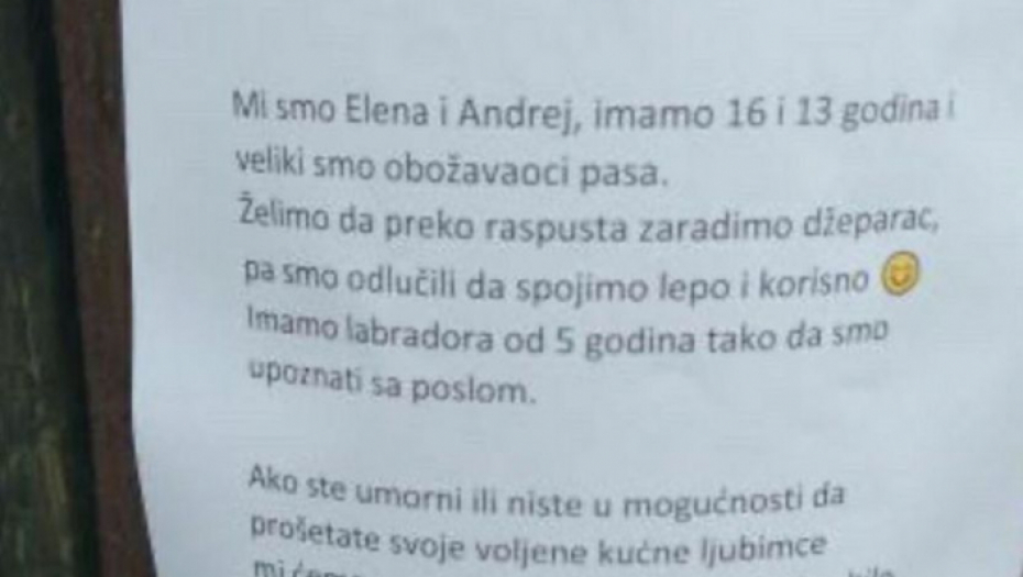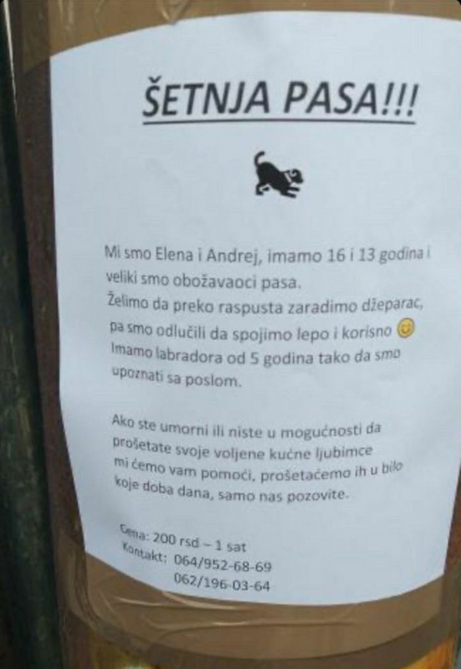 "Mi smo Elena i Andrej, imamo 16 i 13 godina i veliki smo obožavaoci pasa. Želimo da preko raspusta zaradimo džeparac, pa smo odlučili da spojimo lepo i korisno. Imamo labradora od pet godina, pa smo upoznati sa poslom. Ako ste umorni ili niste u mogućnosti da prošetate svoje voljene kućne ljubimce mi ćemo vam pomoći, prošetaćemo ih u bilo koje doba dana, samo nas pozovite", navedeno je u oglasu.