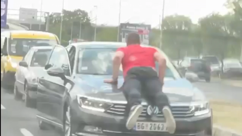Naime, na Instagram stranici "Serbialive Beograd" objavljen je video snimak muškarca u crvenoj majici koji leži na haubi, dok drugi automobili prolaze.