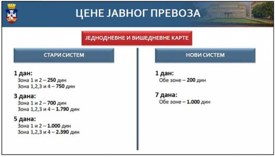 Postojaće višednevna karta koja će koštati 1.000 dinara za sedam dana isto za obe zone.