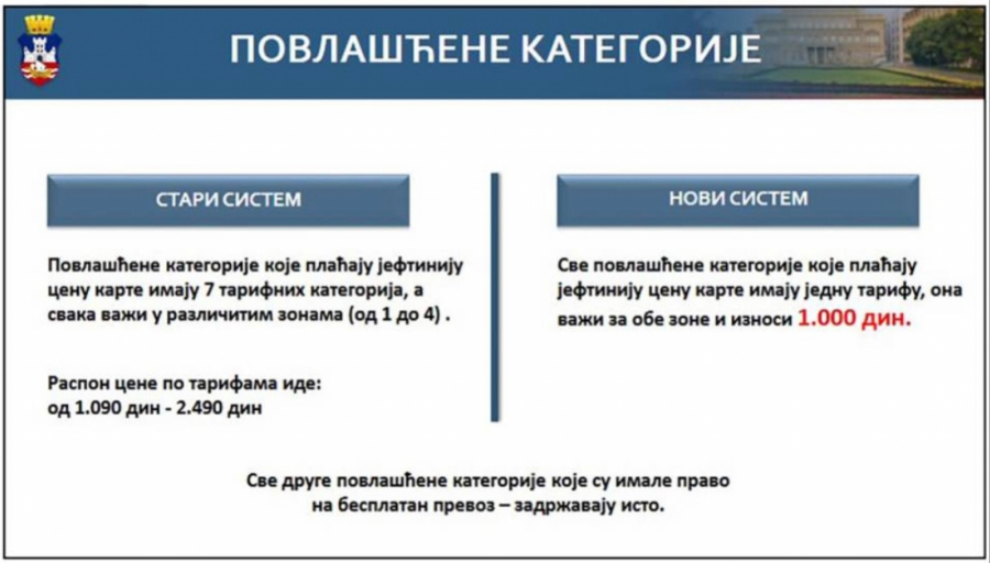 Sve povlašćene kategorije koje plaćaju jeftiniju cenu karte imaju jednu tarifu, ona važi za obe zone i iznosi 1.000 dinara. Po novom sistemu kontrolu karata i naplatu kazni vršiće BELI.