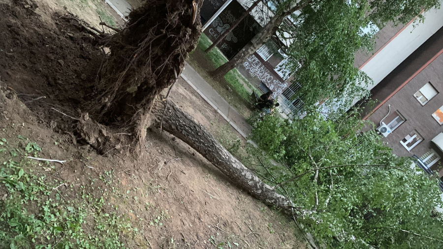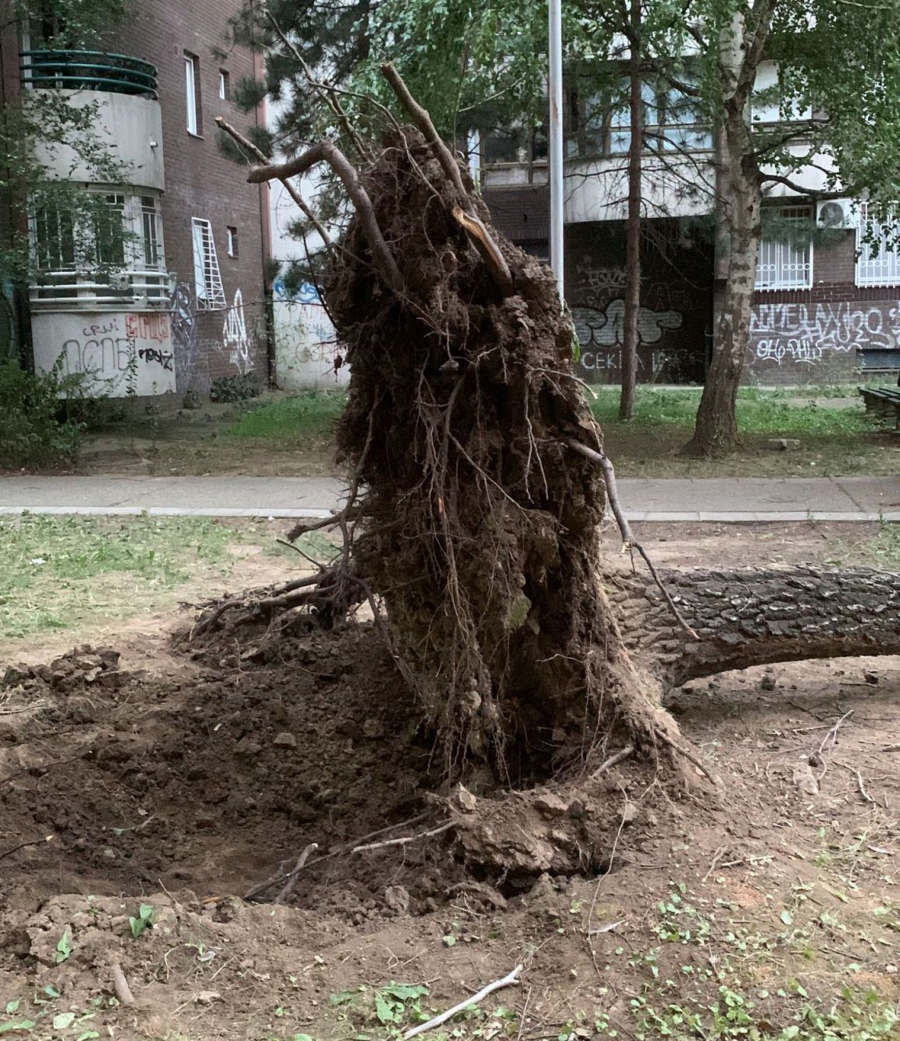 Tako je drveće u Čukaričkom parku u Beogradu, oslabljeno vetrom koji je dostizao brzinu i do 100 kilometara na čas, danas popadalo, i to iz korena.