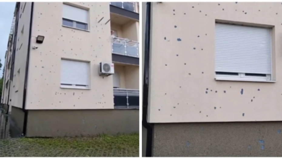 Zgrada izgleda kao da je neko ispalio rafale u nju. Vide se rupe od grada koji je nemilosrdno tukao.