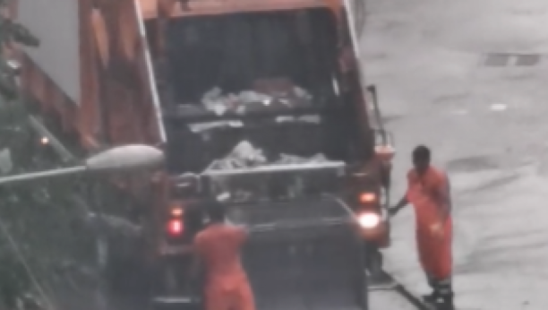 Na snimku se vide radnici koji prazne kontejner na svojoj ruti i nastavljaju čišćenje čak i pored nevremena koje je danas zahvatilo pojedine delove Srbije.