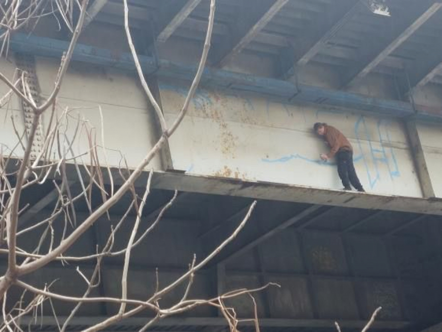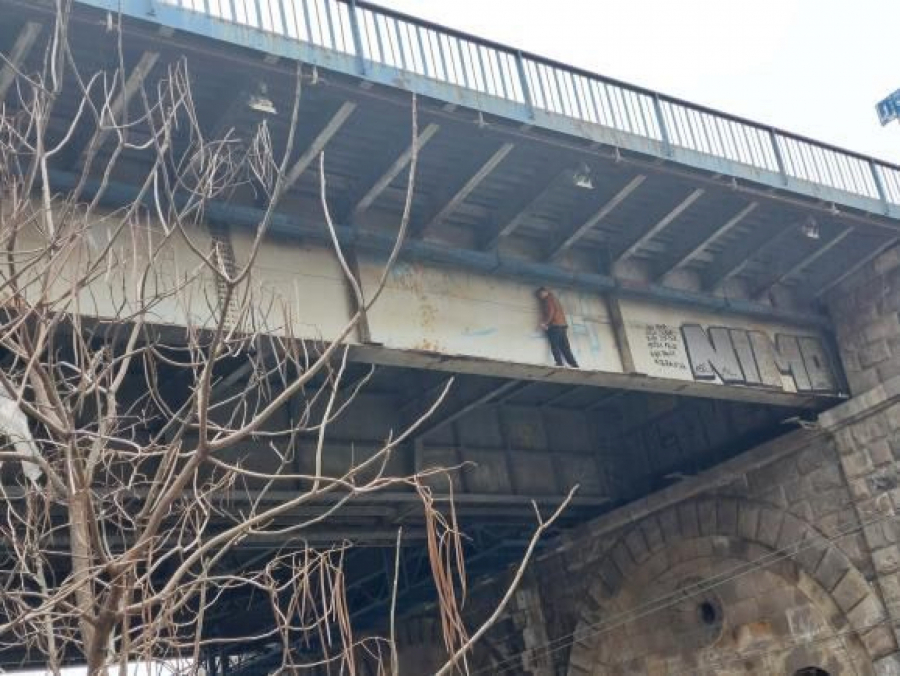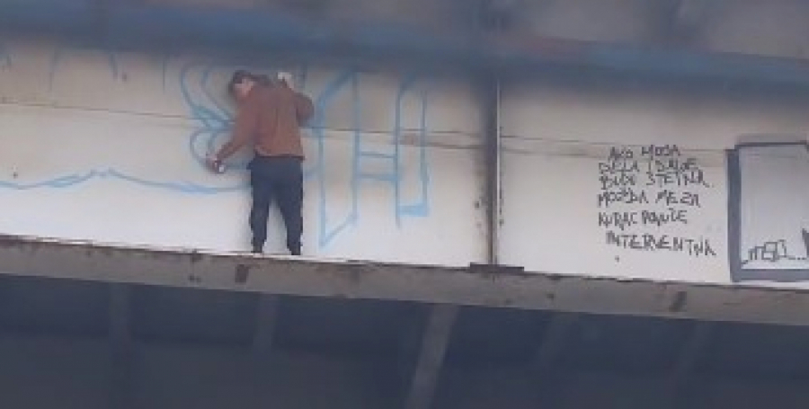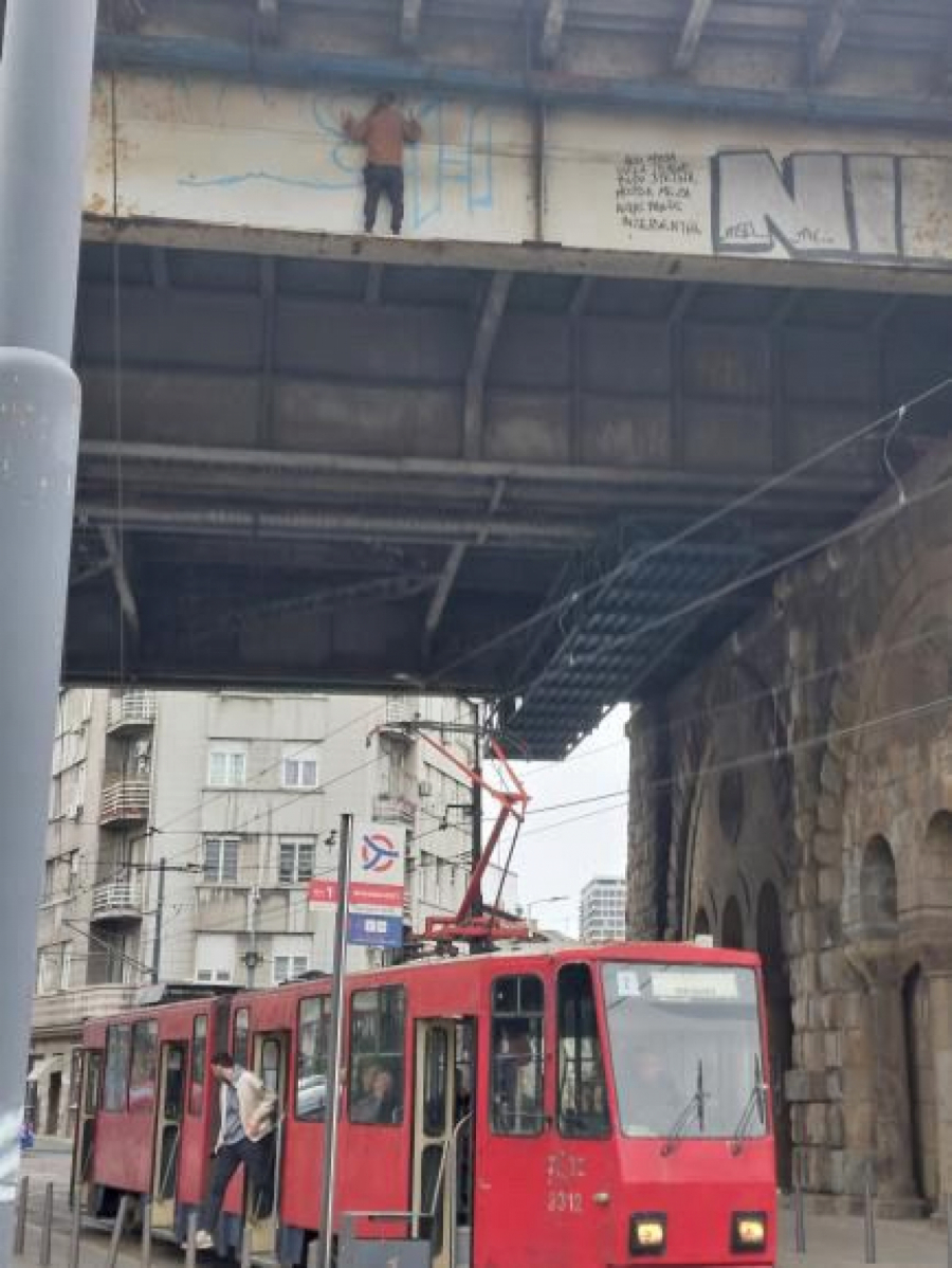 Kako se vidi na snimku, mladić se popeo na međuprostor Brankovog mosta i rizikovao svoj život kako bi nacrtao grafit.