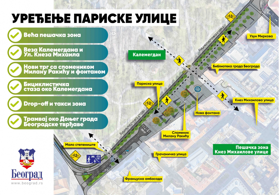 Došlo vreme da sprovedemo u delo ideju koja je nastala još 80-tih godina kada je na predlog Brana Jovina trebalo da se ovaj deo od Kalemegdanske tvrđave do Terazijske česme pretvori u pešačku zonu čime bi konačno bilo omogućeno Beograđanima i svima onima koji dođu u naš grad, da nesmetano od beogradskog Pobednika i kroz čitav Kalamegdanski park prolaze skroz do Terazijske česme.