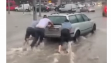 KAD JE NEVREME, MORA ''NA GURKU''! Momci zasukali rukave i nogavice, pa guraju auto kroz bujicu na Autokomandi! (VIDEO)