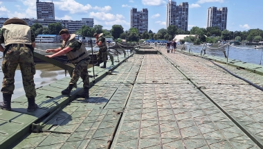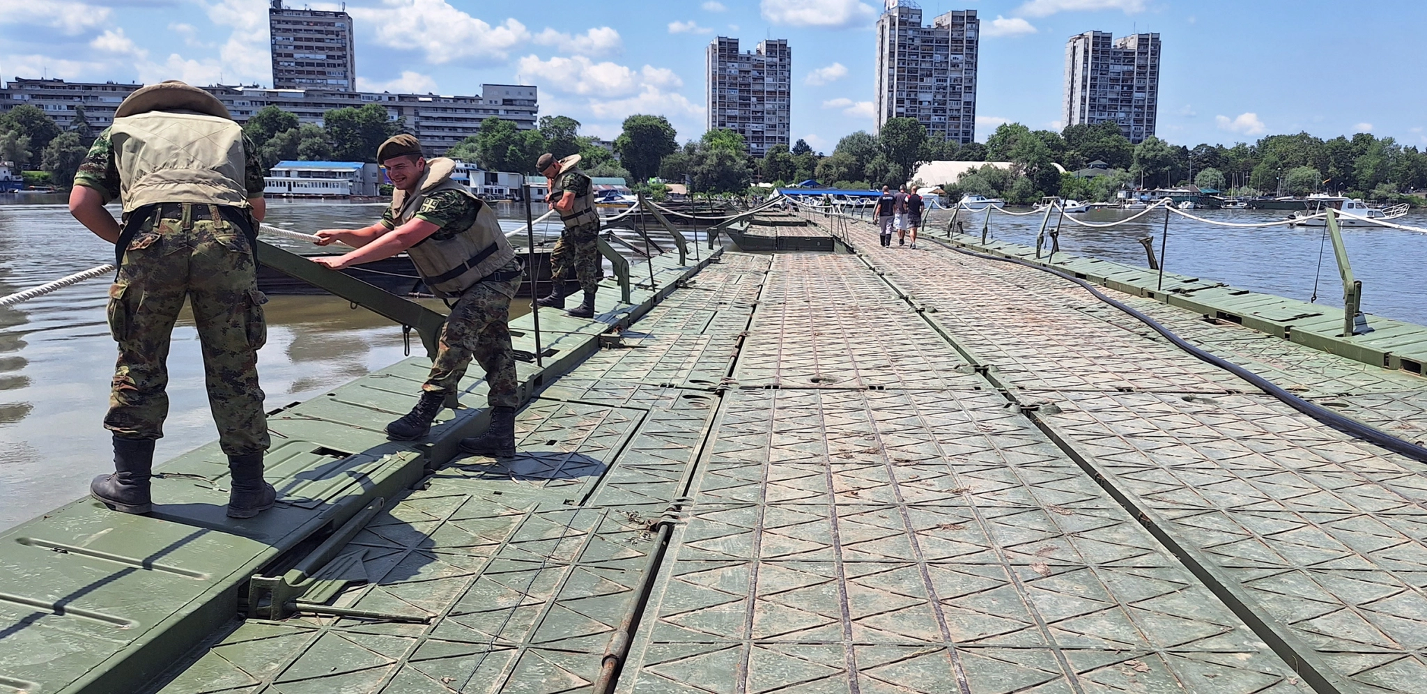Na fotografiji vidimo da pripadnici pontonirskih jedinica Vojske Srbije postavljaju pontonsi mosta preko Dunava. Tačnije od Zemunskog keja do Velikog ratnog ostrva, koji će omogućiti građanima Beograda da i ovo leto provedu na dunavskoj plaži Lido.