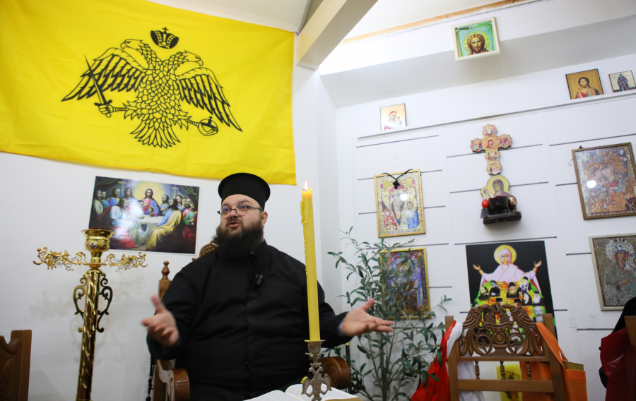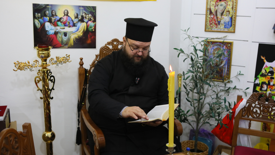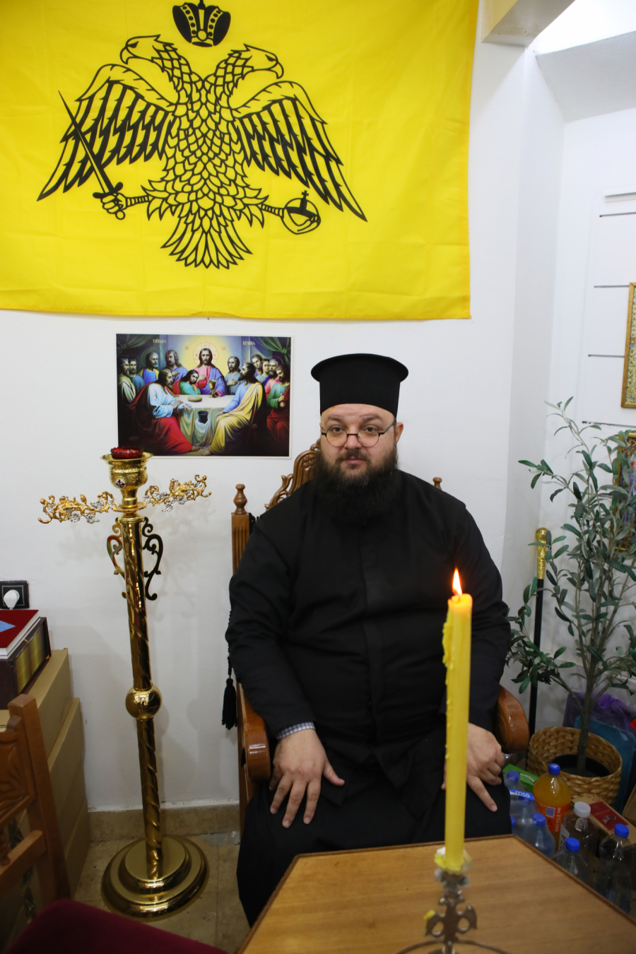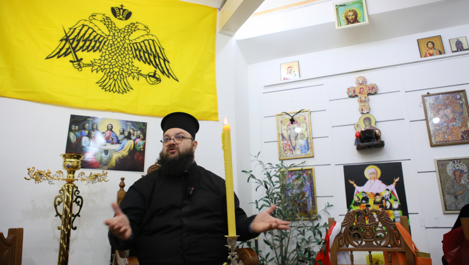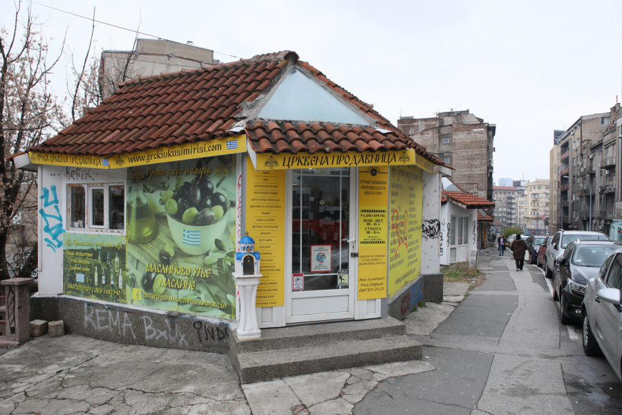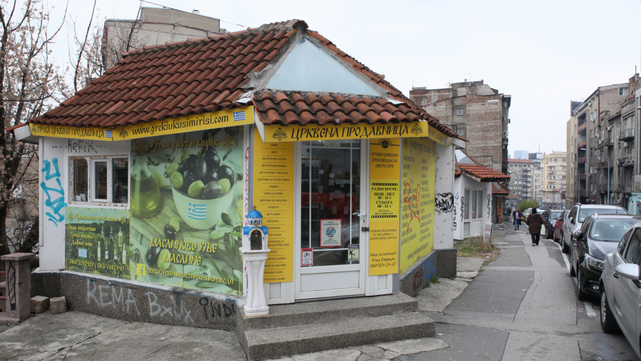 Vrata grčke crkvene prodavnice Svetogorskih manastirskih proizvoda nam je otvorio otac Spiridon, koji nam je objasnio da se na toj lokaciji nalaze već četiri godine i da nemaju problema sa komšijama, čak dolaze da kupe tamjan od njega.