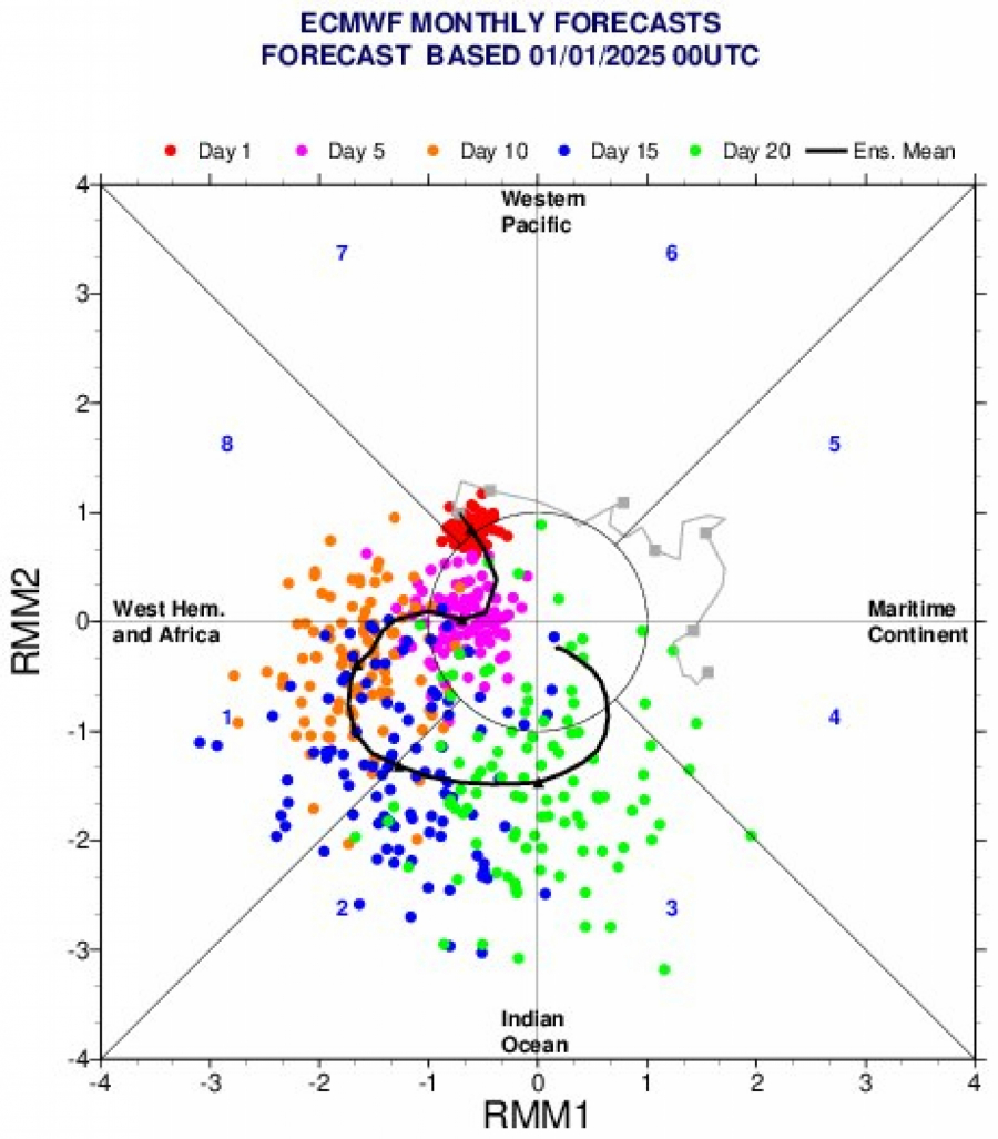 MJO indeks ulazi u prvoj dekadi januara u fazu 1, zatim brzo i u fazu 2 što znači da bi druga polovina januara bila prava zimska, hladna i sa puno snega, zaključuje Ristić.