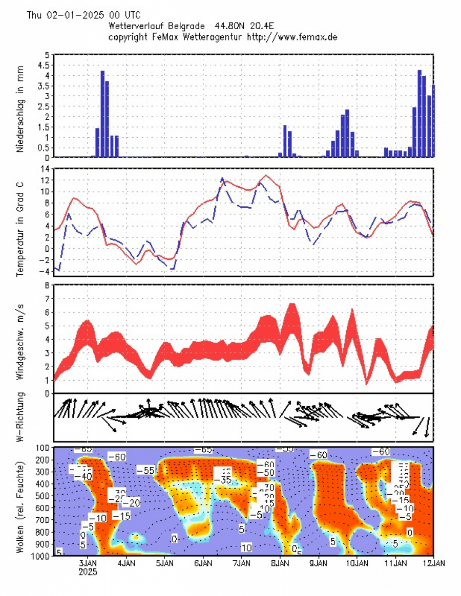 Najviša temperatura u drugoj polovini sledeće nedelje biće u postepenom padu, tako da za dane sledećeg vikenda 11. i 12. januara sneg se očekuje i u nižim predelima prvo na severu Srbije.