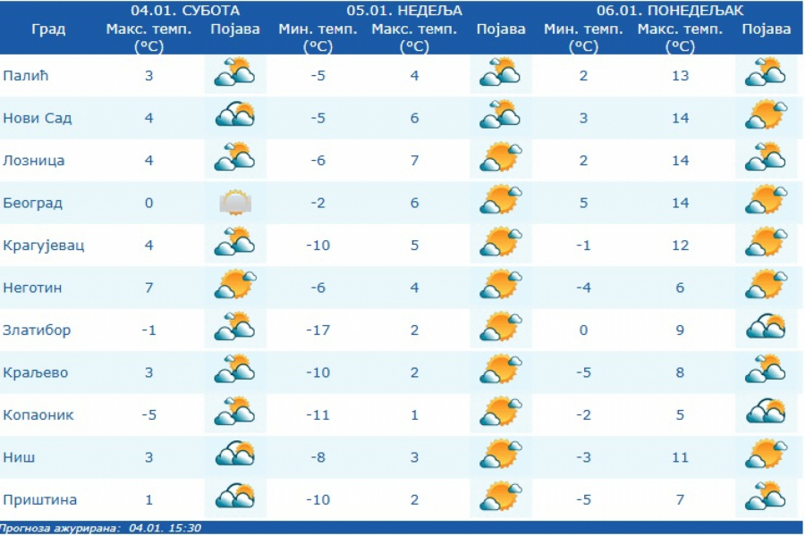 Najniža temperatura od -13 stepeni Celzijusa na jugozapadu i jugoistoku Srbije (na Pešterskoj visoravni i oko -17 C) do -2 stepeni u Beogradu i južnom Banatu. Najviša temperatura od 1 do 7 stepeni.
