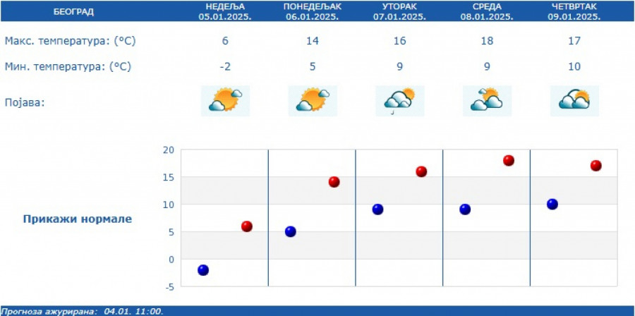 Prema izgledima vremena za narednih sedam dana, od 6. do 10. januara biće malo do umereno oblačno uz osetniji porast jutarnjih i dnevnih temperatura.