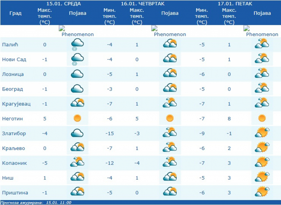 U Beogradu će u toku dana biti umereno oblačno, a mogući su i kraći sunčani intervali, dok će temperatura biti od minus pet do nula stepeni.