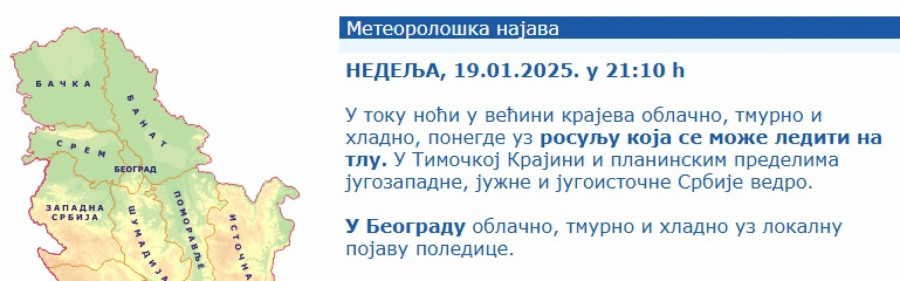 U toku noći u većini krajeva oblačno, tmurno i hladno, ponegde uz rosulju koja se može lediti na tlu. U Timočkoj Krajini i planinskim predelima jugozapadne, južne i jugoistočne Srbije vedro, stoji u najavi RHMZ od 21:10 časova.