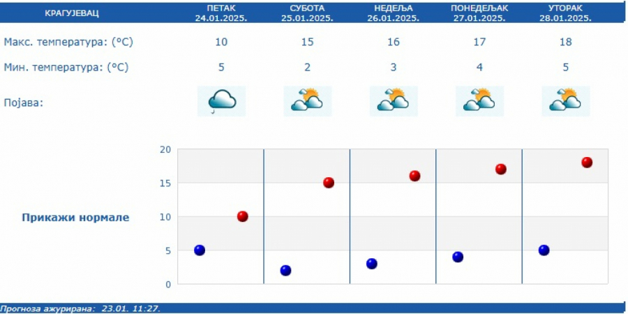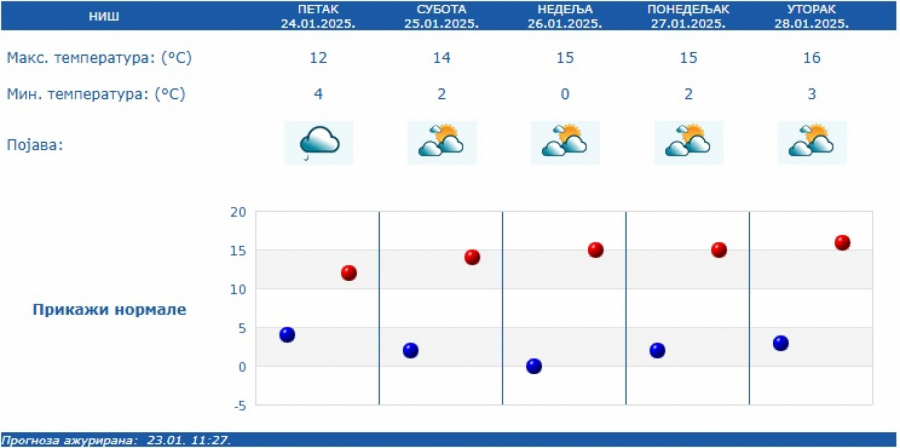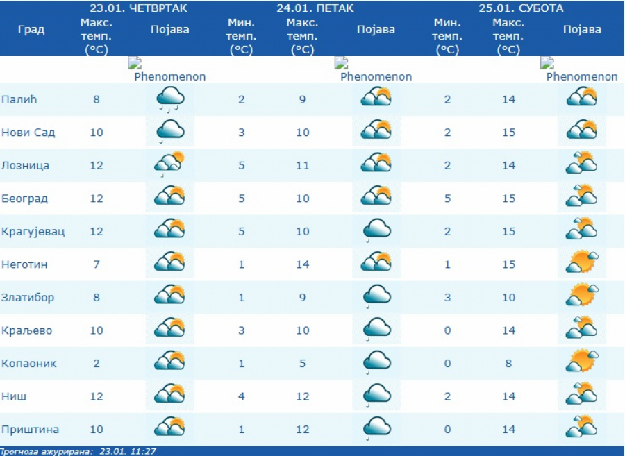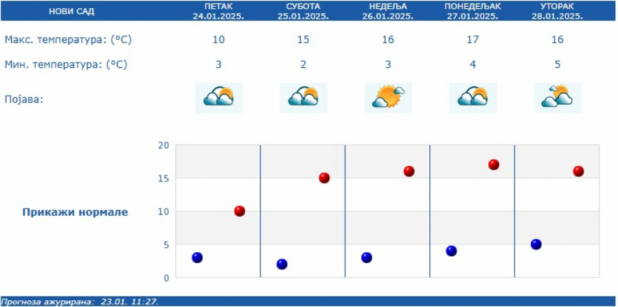 Duvaće slab promenljiv vetar. Najniža temperatura biće oko 5 stepeni, a najviša dnevna oko 10 stepeni. Tokom večeri i noći očekuje se magla ili niska oblačnost.