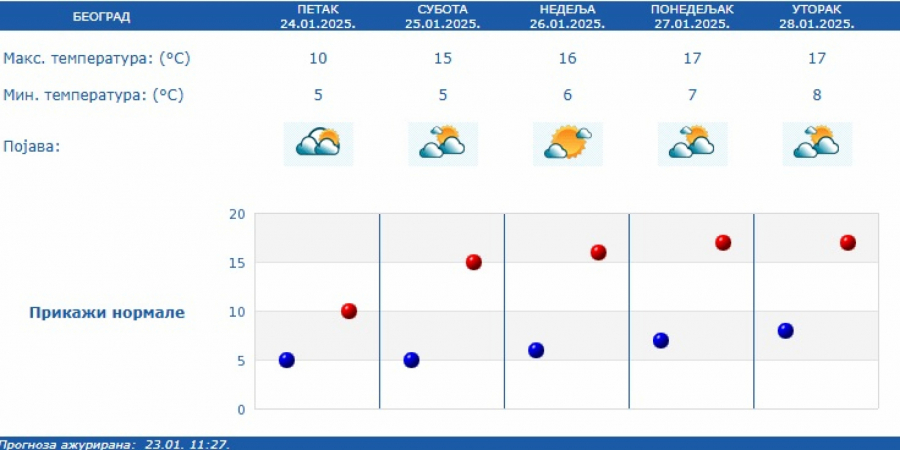 U Srbiji se tokom idućih sedam dana očekuje osetno toplije vreme uz najvišu dnevnu temperaturu koja će biti znatno iznad proseka za treću dekadu januara i u većini mesta kretaće se od 14 do 18 stepeni.