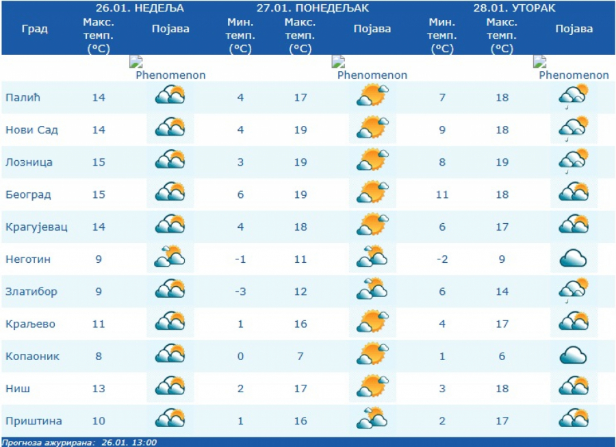 Tokom dana očekuje se postepeno naoblačenje sa zapada, koje će posle podne u severnim i zapadnim, a uveče i noću i u ostalim predelima usloviti kišu i lokalne pljuskove.