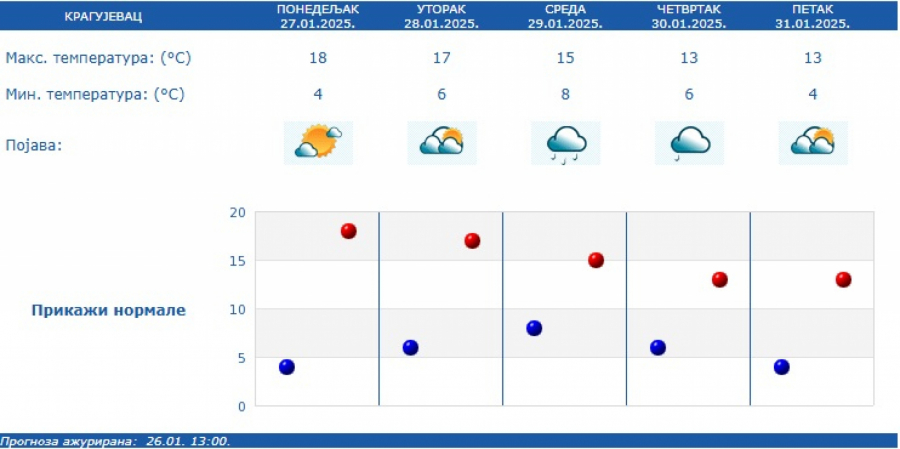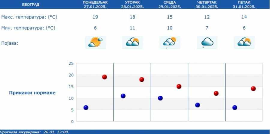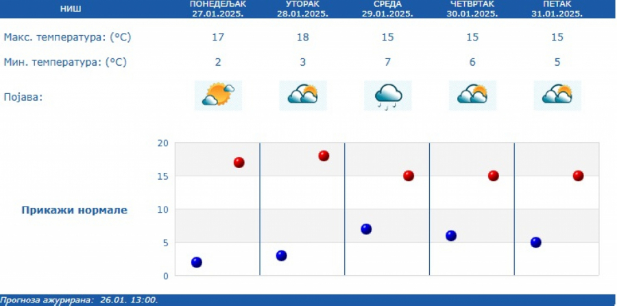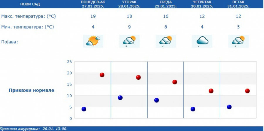 Duvaće slab i umeren, južni i jugoistočni vetar. Najniža temperatura biće oko 6 stepeni, a najviša dnevna oko 19.