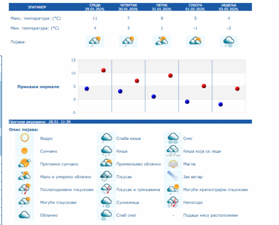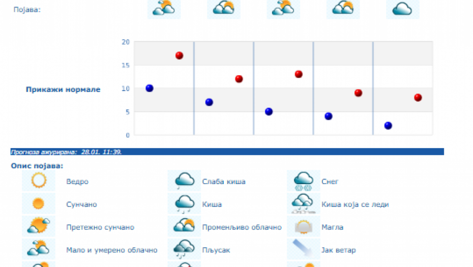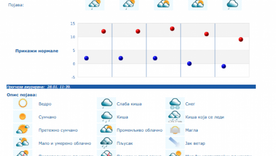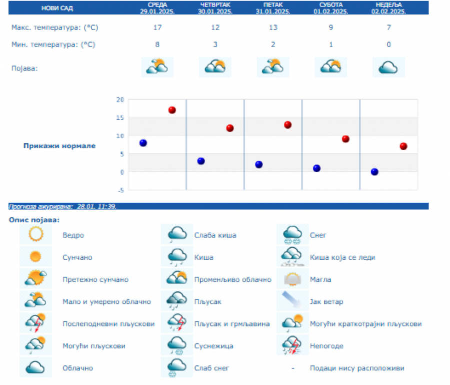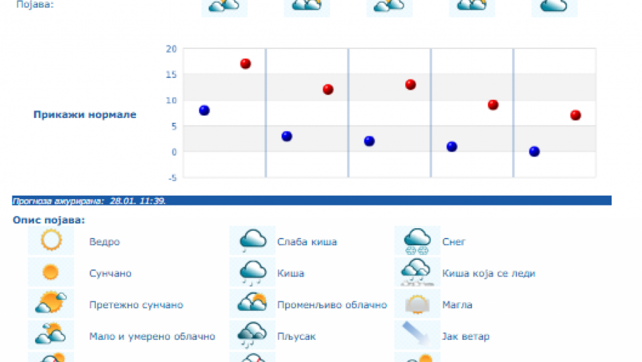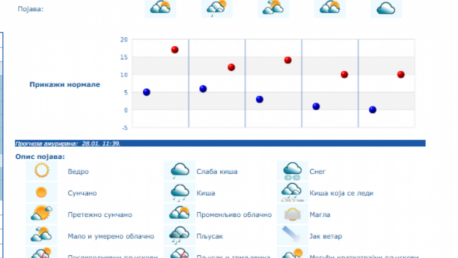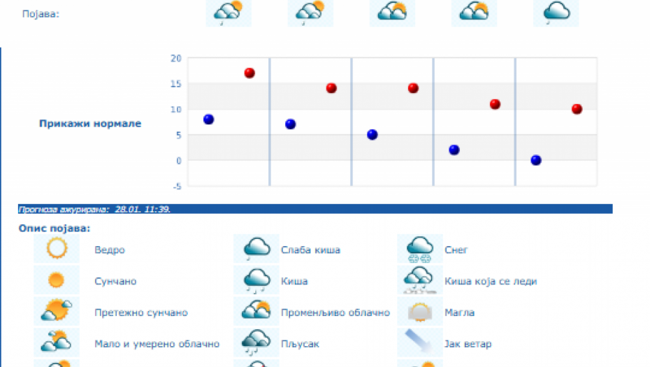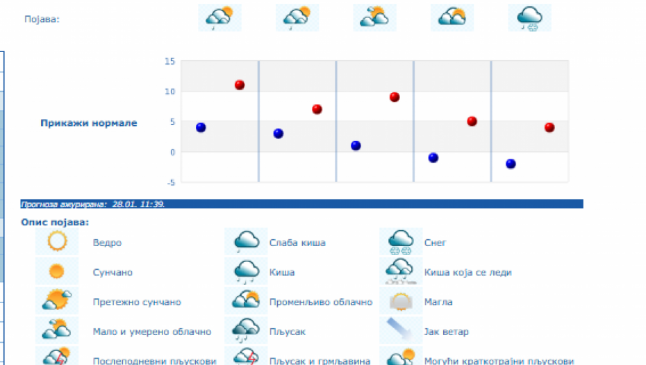 Duvaće slab do umeren, uglavnom južni i jugozapadni vetar. Najniža temperatura biće od 5 do 10 stepeni, a najviša oko 17.
