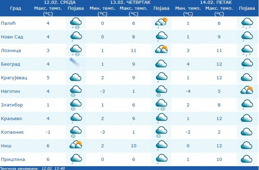 Najniža temperatura biće od -3 do tri stepena, a najviša od jedan stepen na istoku do 11 stepeni na zapadu Srbije.