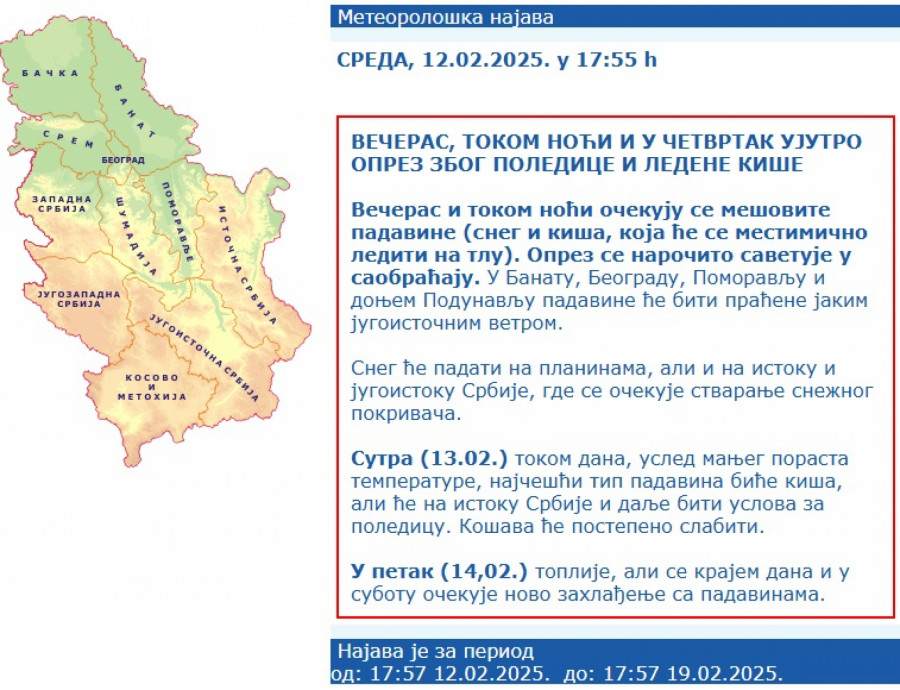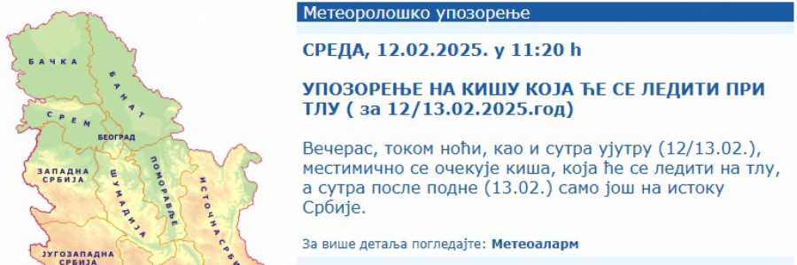 Pri tome će se kiša lokalno lediti na tlu, saopštio je Republički hidrometeorološki zavod (RHMZ).