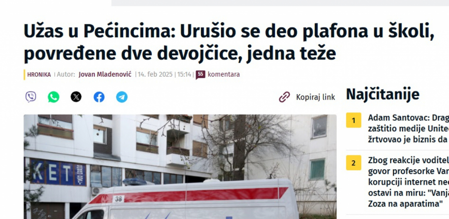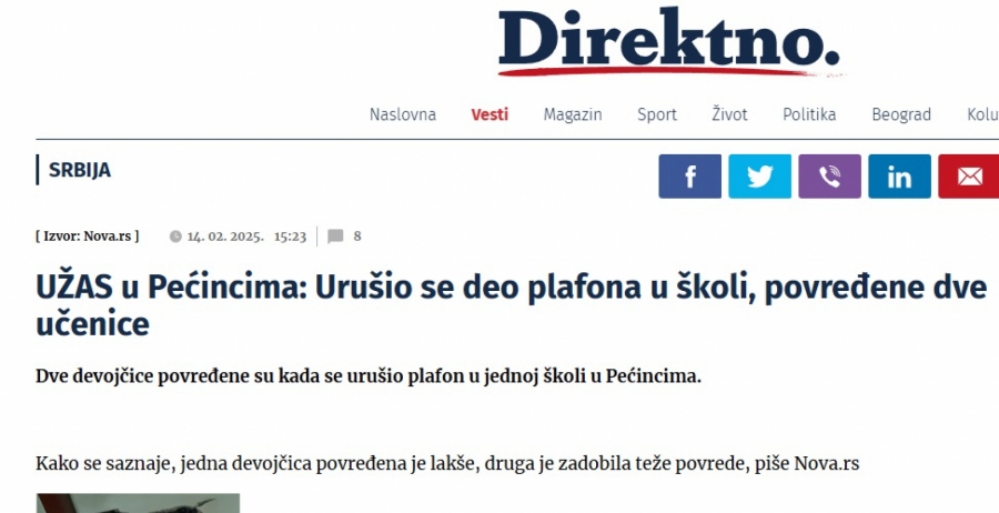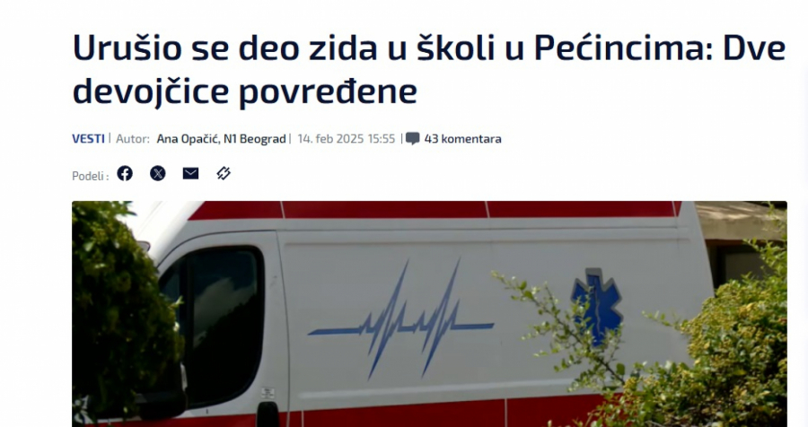 Na sajtu Osnovne škole "Slobodan Bajić Paja" u Pećincima prethodno je objavljeno da je tokom časa otpao deo maltera sa zida na dve devojčice.