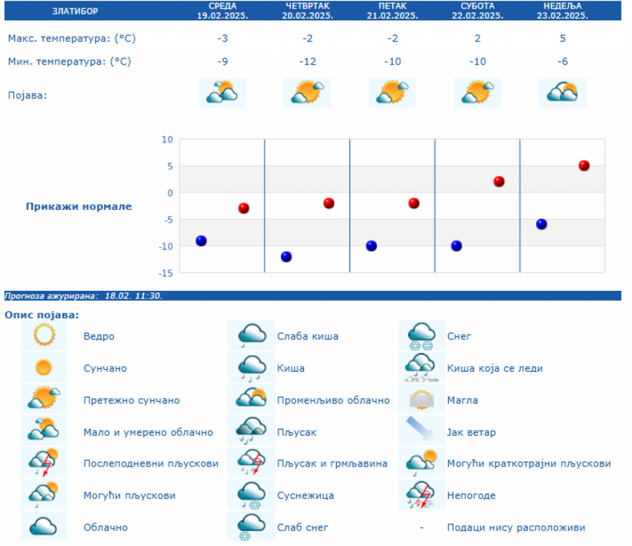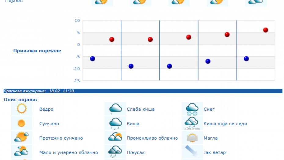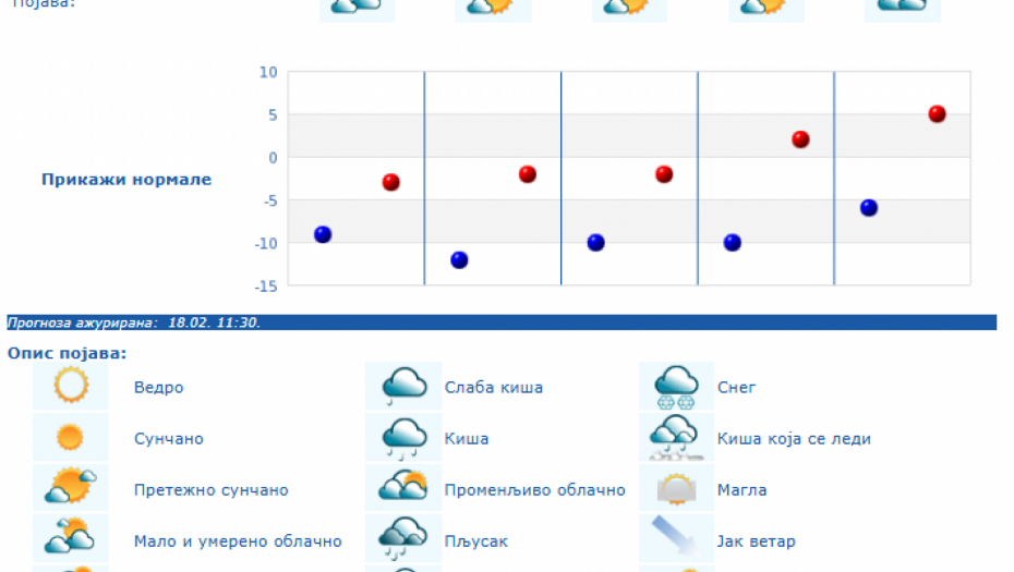 U Srbiji će do kraja sedmice biti hladno sa umerenim i jakim jutarnjim mrazem uz minimalnu temperaturu u većini mesta od -12 do -4 stepeni. Tokom dana biće pretežno sunčano vreme, krajem sedmice uz prolaznu umerenu oblačnost. U petak uveče i za vikend u košavskom području duvaće umeren i jak jugoistočni vetar. Maksimalna temperatura biće od 2 stepena sredinom sedmice do 8 stepeni za dane vikenda, samo će se u Timočkoj Krajini zadržati hladnije vreme.