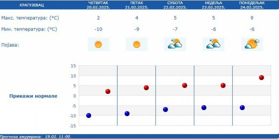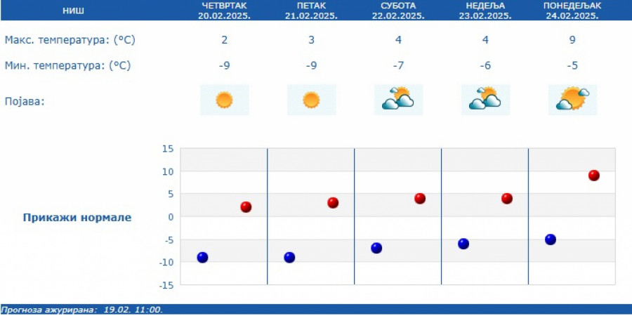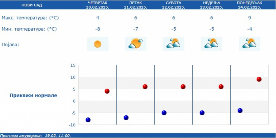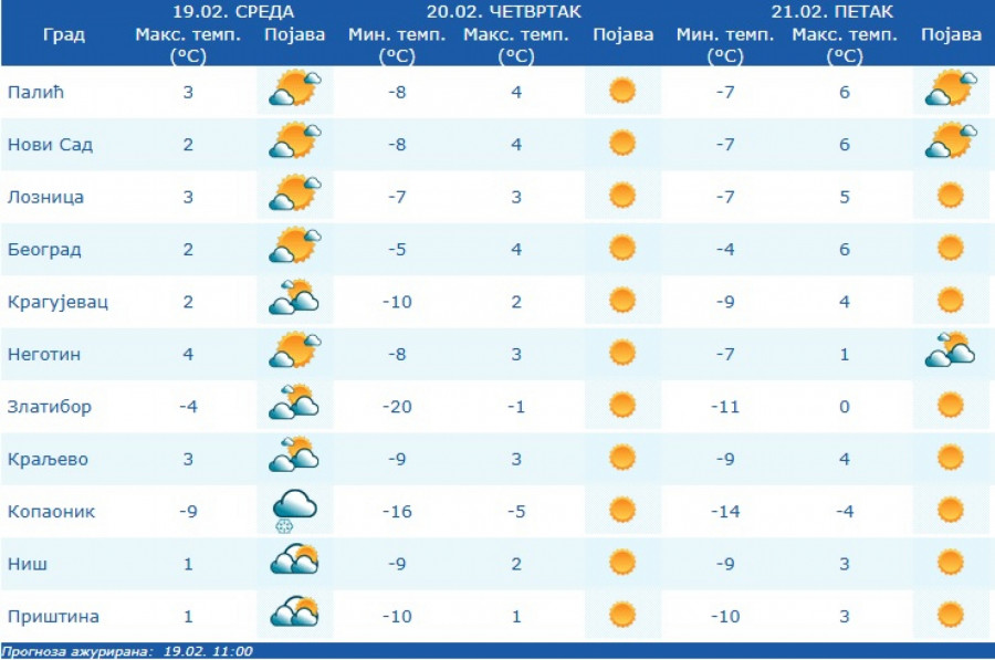 I za dane vikenda, uglavnom van košavskog područja, u jutarnjim satima očekuje se pojava jakih mrazeva, u nižim predelima sa vrednostima minimalne temperature mestimično ispod -10 stepeni, a na planinama lokalno i ispod -15.