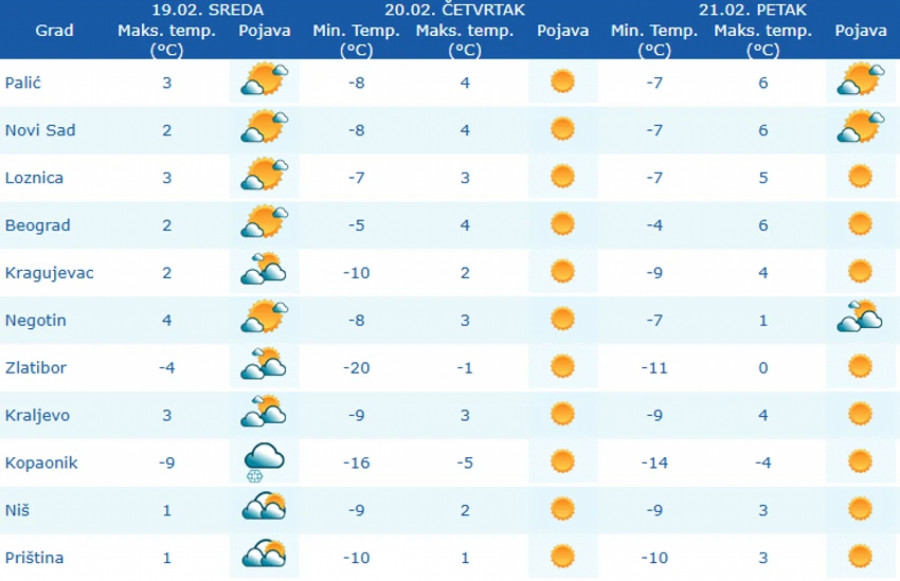 - U nižim predelima vrednosti minimalne temperature iznosiće mestimično ispod -10, a na planinama lokalno i ispod -15 stepeni - upozoravaju iz RHMZ-a.