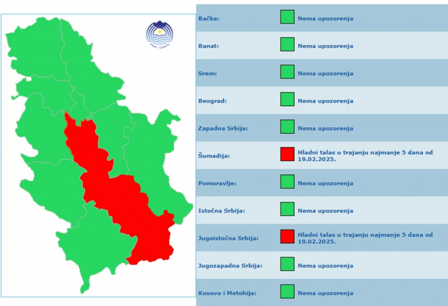 - Hladni talas u trajanju od najmanje 5 uzastopnih dana. S obzirom na intenzitet i vreme trajanja prognozira se veoma opasna vremenska pojava. Budite veoma obazrivi i pratite zvanična saopštenja o vremenu i prognozi vremena - navodi se na sajtu RHMZ.