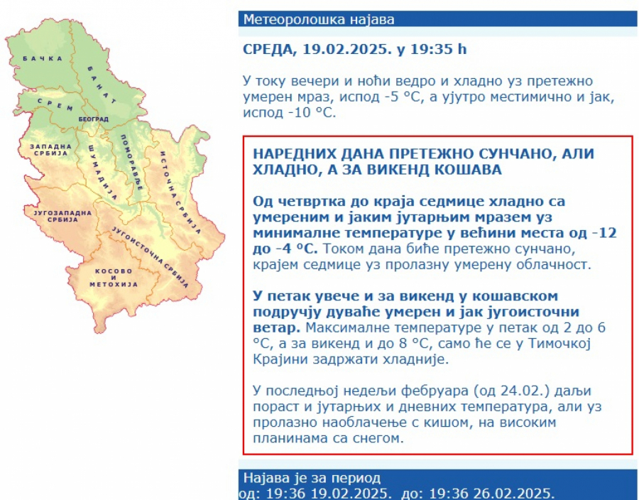 Republički hidrometeorološki zavod (RHMZ) najavio je da se u četvrtak i petak, 20. i 21. februara, u svim regionima Srbije, a za dane vikenda, 22. i 23. februar, uglavnom van košavskog područja, u jutarnjim satima očekuje pojava jakih mrazeva.