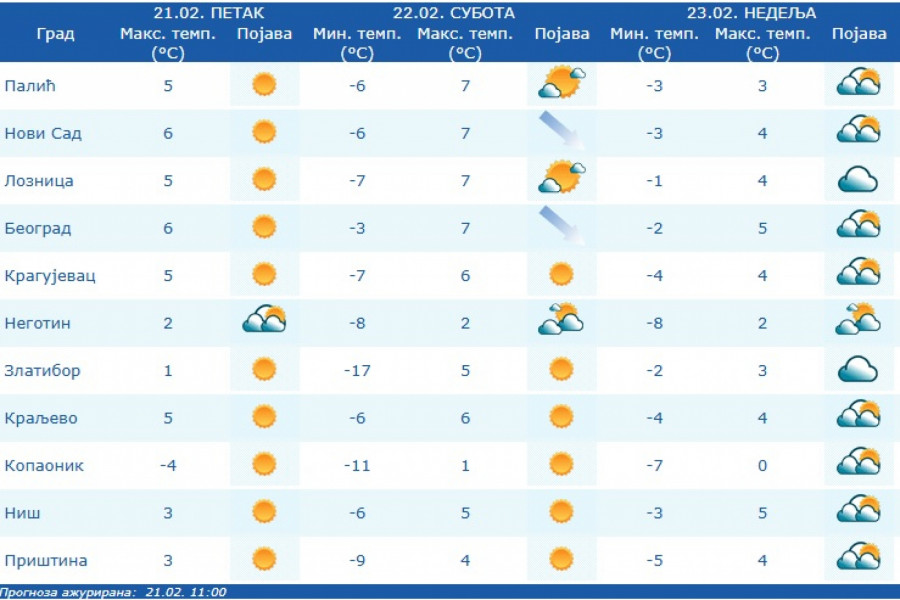 U nedelju (23.02.) jutro hladno sa slabim i umerenim mrazem, a tokom dana pretežno sunčano, u košavskom području i vetrovito sa umerenim i jakim jugoistočnim vetrom.