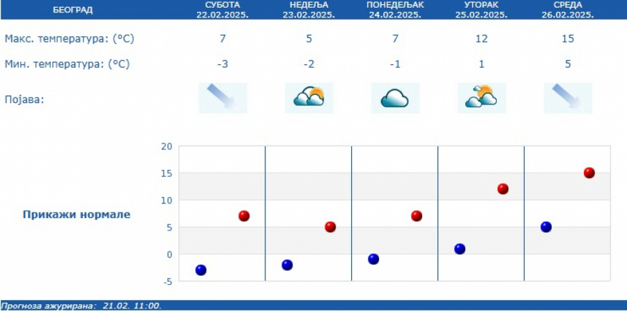 Od utorka (25.02.) malo do umereno oblačno i suvo vreme uz postepeni porast i jutarnjih i dnevnih temperatura, a krajem perioda (28.02.) novo naoblačenje sa padavinama.