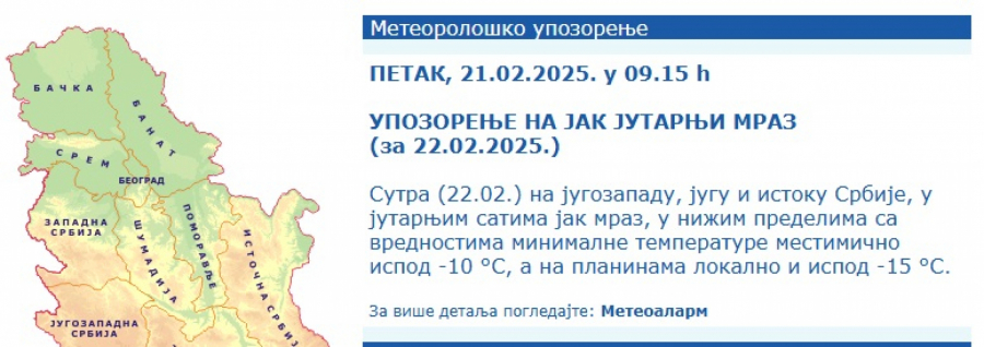 Meteoalarm je proglašen na teritoriji cele Srbije zbog ekstremno niskih temperatura.