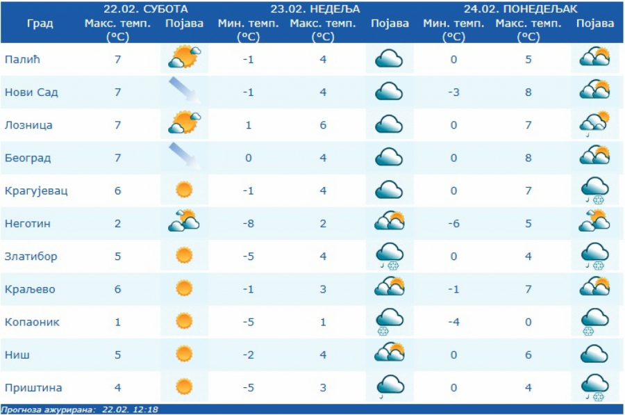 Prema prognozi Republičkog hidrometeorološkog zavoda, najniža temperatura će biti od -8 do 1, a najviša dnevna od 2 do 6 stepeni Celzijusa.