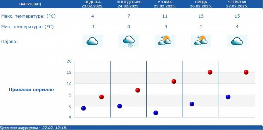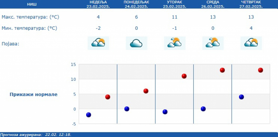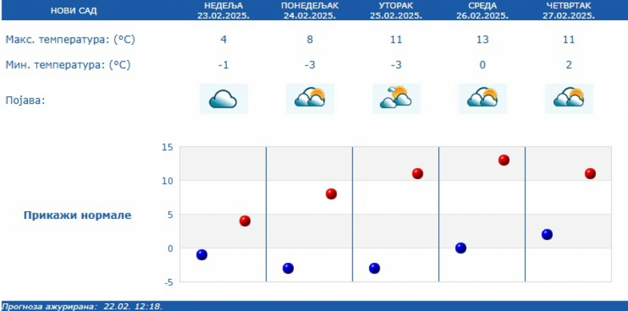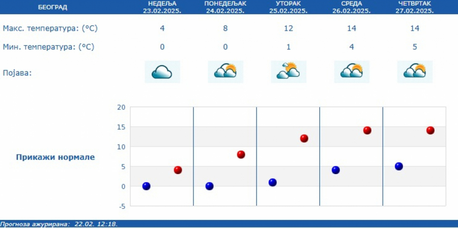 Prema izgledima vremena za narednih sedam dana (do 2. marta), u ponedeljak umereno do potpuno oblačno, na zapadu, jugozapadu i jugu mestimično sa slabom kišom, u brdsko-planinskim predelima sa susnežicom i snegom.