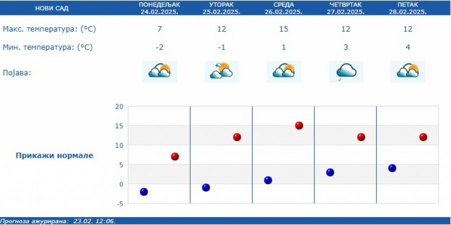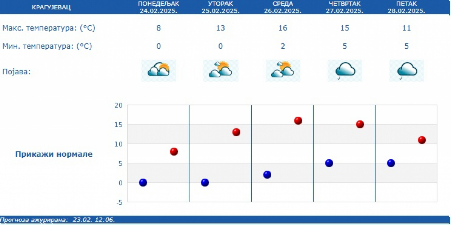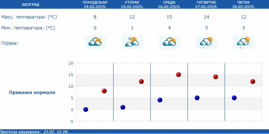 U utorak i sredu iznad većeg dela zemlje biće suvo vreme. U sredu posle podne i uveče na zapadu i jugozapadu Srbije, kao i na zapadu Vojvodine, a od četvrtka ponegde i u ostalim krajevima prognozira se kiša, dok je samo na visokim planinama kratkotrajno moguć i slab sneg.
