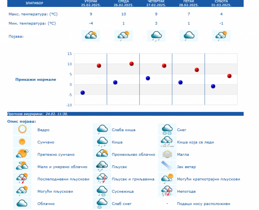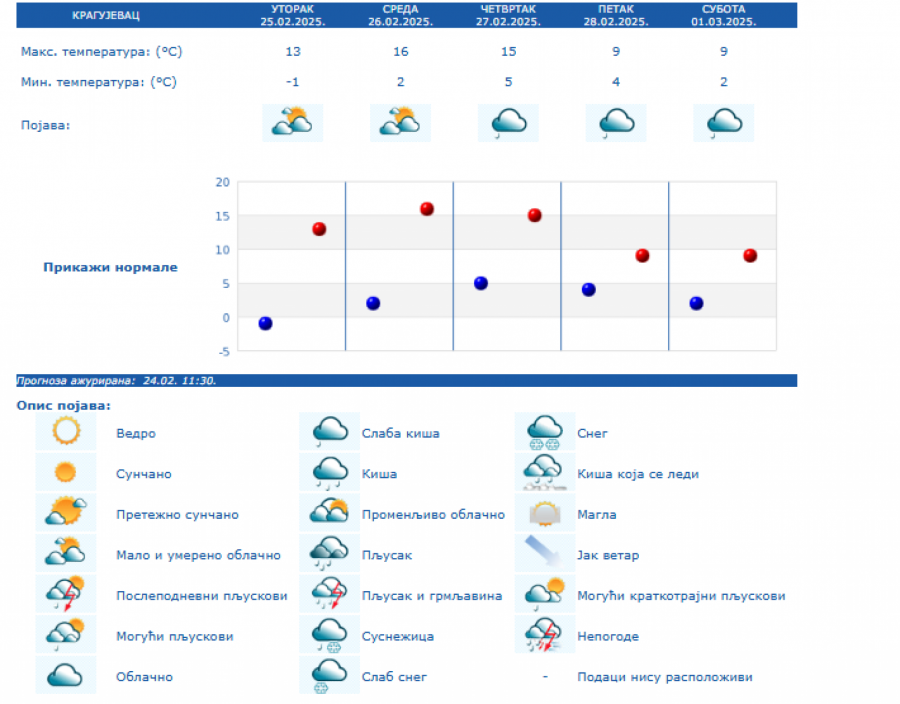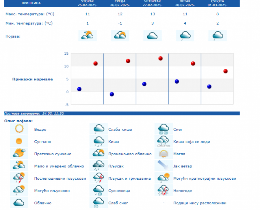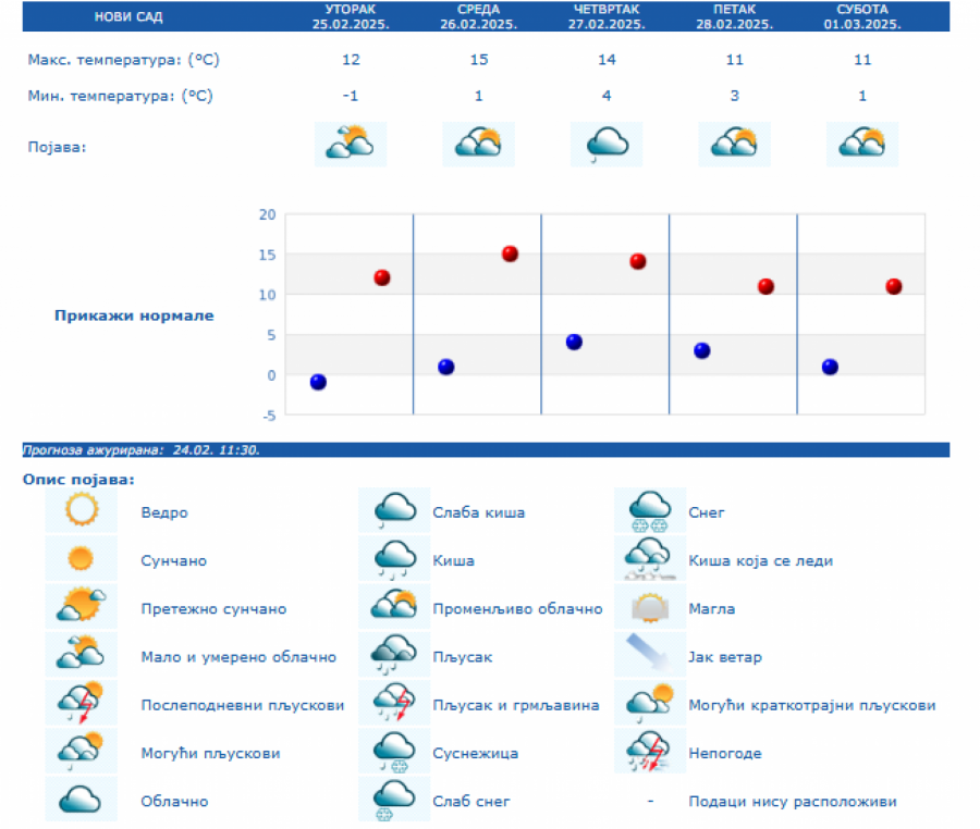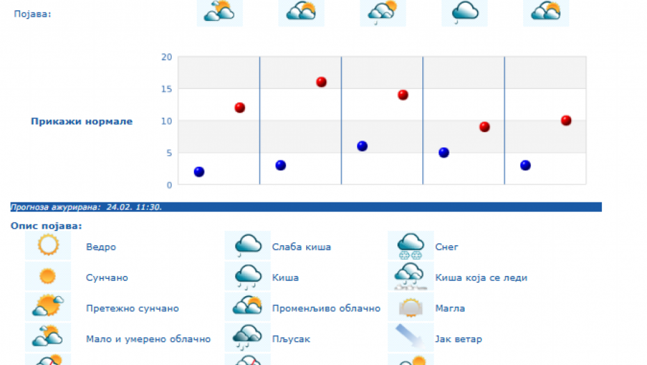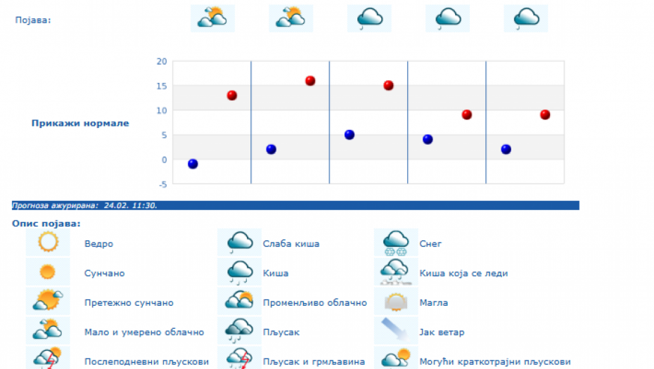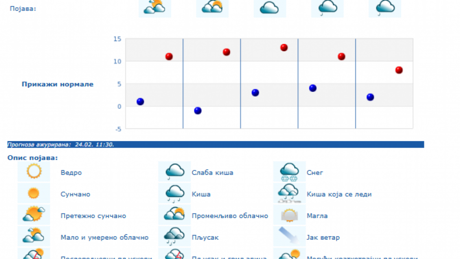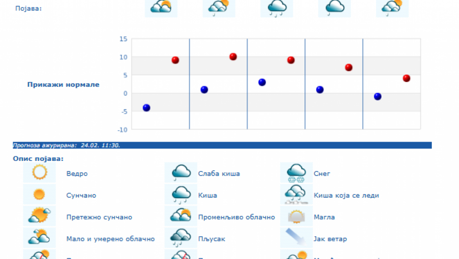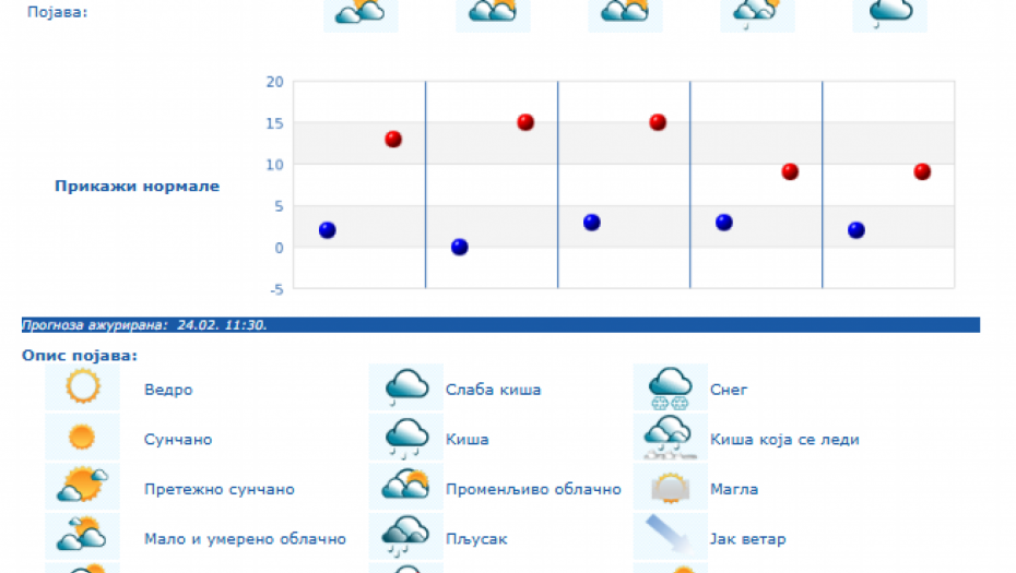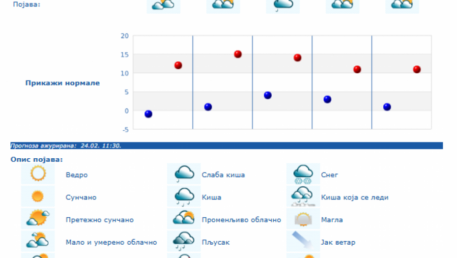 Do kraja nedelje zadržaće se umereno do potpuno oblačno vreme, dok se za vikend padavine očekuju južnije od Save i Dunava, i to u nižim krajevima kiša, a u brdsko-planinskim predelima jugozapadne, južne i istočne Srbije sneg, i to naročito u nedelju.